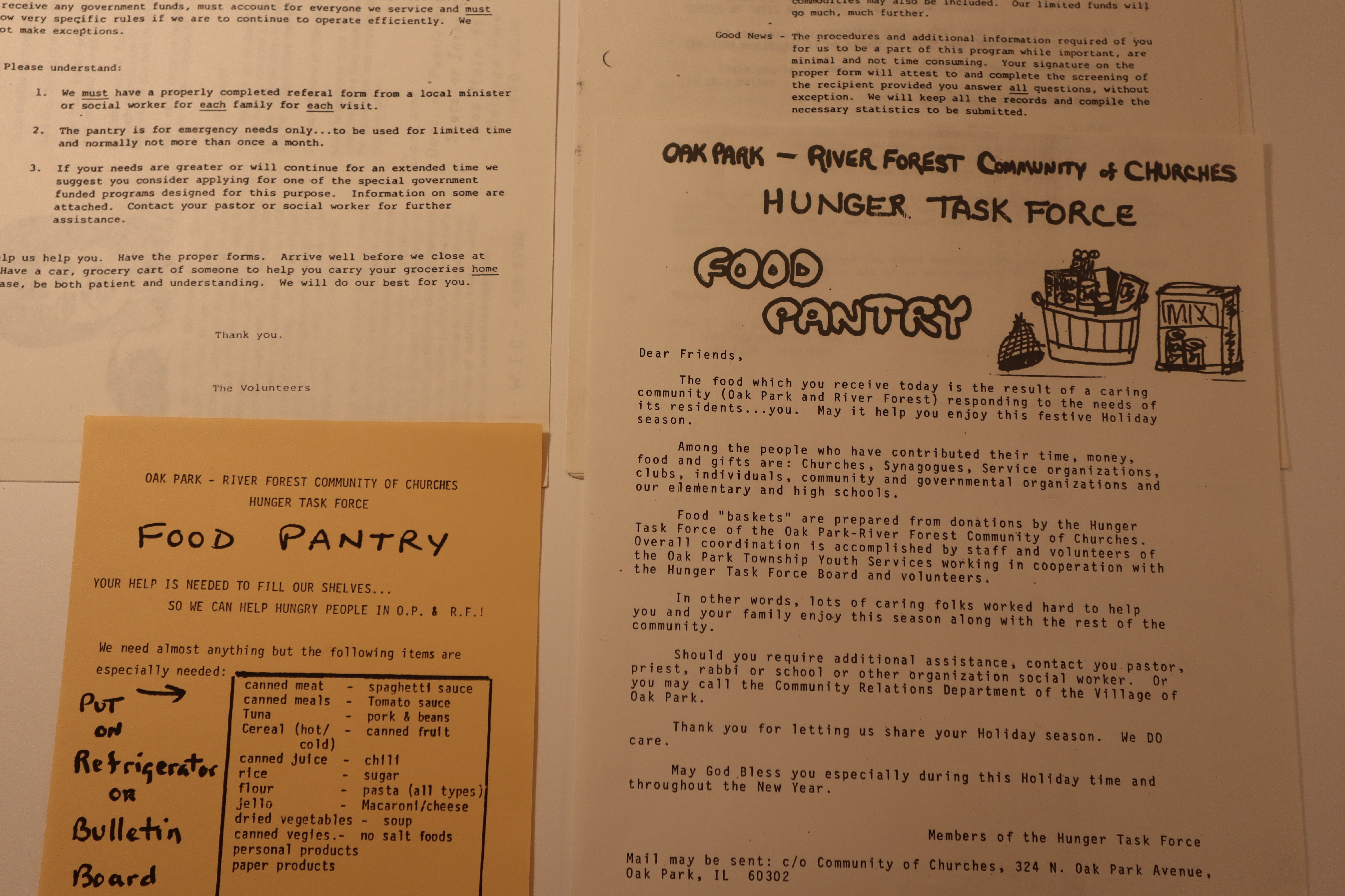 Oak Park River Forest Food Pantry began in the late 1970s by a small group of concerned citizens lead by Patricia Funk, a local Girl Scouts leader. Initially known as the Hunger Task Force Food Pantry, we operated out of Faith United Methodist Church for our first several years, becoming a program of the Community of Congregations.